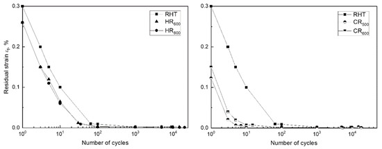 A decrease in residual strain in a cycle with an increase in the number of cycles was associated with increasing dislocation yield stress (Figure 4). With an increase in the dislocation yield stress at 0.5% strain, the reversible elastic strain area increased, which led to a decrease in the residual strain in the cycle. Accordingly, the value of the accumulated strain in the case of the RHT regime was the largest (5.4%) compared to the TMT regimes (Figure 6).