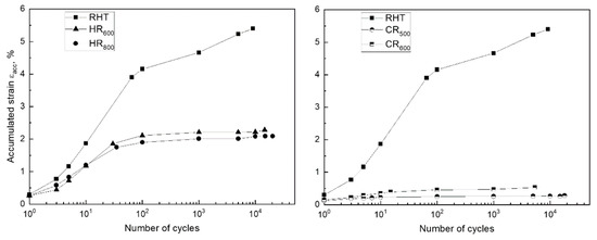 The obtained stress–strain diagrams were used to determine the residual strain εf in each cycle and the total accumulated strain εacc for the Fe-30Mn-5Si alloy in the initial state and after TMT; the obtained dependencies are shown in Figure 5 and Figure 6, respectively. The residual strain in the first cycle was the greatest after RHT, it was smaller after HR800 and HR600, and it was the smallest after CR500 and CR600. Figure 5 shows that for all processing modes, a decrease in the residual strain value is observed in each cycle during mechanocycling; this process occurred more slowly after RHT than after TMT.