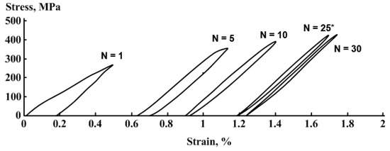 Stress–strain diagrams obtained after a various number of loading–unloading cycles are presented in Figure 8. An initial range of each stress–strain diagram demonstrates a linear stress increase. Then, after reaching a dislocation yield stress, deviation from linearity began, which increased with the strain increase and development of a dislocation flow mechanism. Note that the similar deviation can be attributed to the intensification of the stress-induced γ→ε transformation. That is confirmed by the results of [25,45,46,47,48], which showed that after reaching the apparent dislocation yield stress, the deformation process included the γ→ε martensitic transformation.