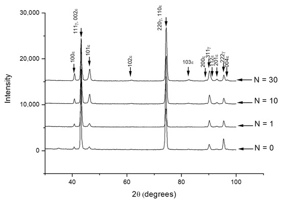 Figure 9 presents X-ray diffractograms of HR800 samples obtained after cyclic loading–unloading with various number of cycles up to N = 30 in accordance with diagrams presented in Figure 8. Figure 9 shows that before cycling (N = 0), the sample contains both γ-austenite and ε-martensite. Note that the mechanocycling is carried out at room temperature while the starting temperature Ms for the γ→ε transformation locates at 38 °С while its finishing temperature Mf, in a subzero temperature range [24]. Consequently, the alloy must be in a two-phase γ + ε state at room temperature after HR800 treatment. Therefore, during the mechanocycling, additional portions of the stress-induced martensite could form from the retained austenite [25], and this new martensite must be stable because the starting temperature for the reverse ε→γ transformation is as high as As = 136 °С [24].