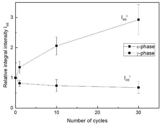 Changes of the γ- and ε-phase volume fractions can be evaluated from Figure 10, which shows that after 30 cycles, the intensity of martensite lines increased approximately threefold, while that of austenite decreases by half. A simple calculation shows that the corresponding quantitative ratio of these phases changed from 20/80 to 60/40.