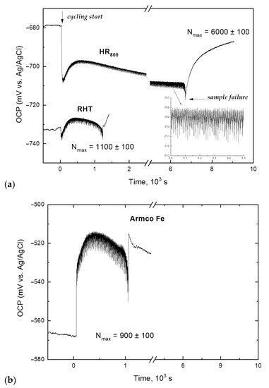 Figure 11 shows typical OCP curves of the Fe-30Mn-5Si alloy (RHT and HR800 regimes) during cyclic dynamic loading in Hanks’ solution at 37 °С; for comparison, the OCP curve of Armco’s iron is also presented. It can be seen from Figure 11a, that the moment of loading start features the OCP shifted to more negative values (by 10–30 mV), regardless of the treatment regime. This is caused by the disruption of the corrosion product layer formed during prior exposure to the test solution.