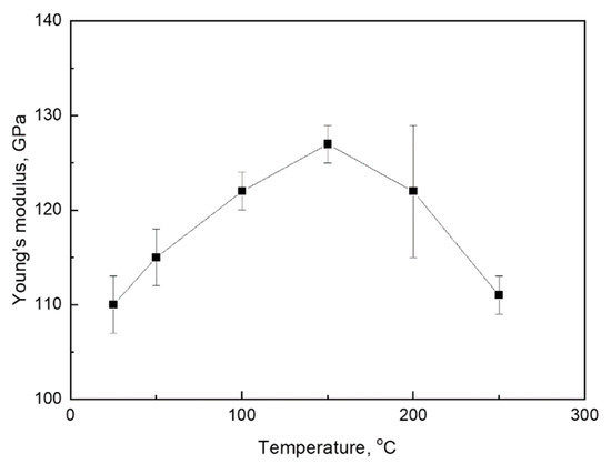 The temperature dependence of Young’s modulus was determined from stress–strain diagrams obtained during specimen tension experiment on a Zwick Z250 universal testing machine (ZwickRoell, Ulm, Germany) using an EXMACRO automatic extensometer (ZwickRoell, Ulm, Germany) and a replaceable load cell with a maximum force of 10 kN. Heating/cooling was carried out in a heat chamber providing access to the sample of high-temperature probes of the strain gauge. The extensometer measuring distance was 15 mm. The sample was stretched to an elongation of 0.05% (the area of elastic strain was selected to avoid strain hardening of the alloy). The tensile rate was 1 mm/min. The sample was fixed using wedge-screw grips placed in a heat chamber. The grips were preheated for 90 min. The sample was held at a given temperature for 30 min. Young’s modulus was calculated by regression using the testXpert III program (ZwickRoell, Ulm, Germany), and by the slope of a straight line coinciding with the initial linear section of the load loop deformation diagram to the abscissa axis. In accordance with the DSC data obtained in [24], the following temperatures for carrying out mechanical tensile tests were selected: 250, 200, 150, 100, and 50 °C, and room temperature. Tests for all experimental temperatures included loading to a strain of 0.05%. In this case, each sample was first heated at 300 °C, and then cooled to the test temperature. Thus, in the initial state before stretching in the temperature range of 50–250 °C, the alloy was in the austenitic state, and at room temperature it contained a small amount of martensite.