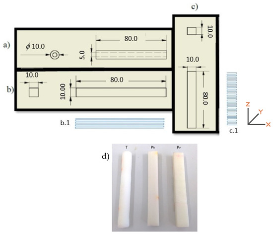 The PCL test pieces were 3D printed using a Bioextruder (homemade) equipment, equipped with a mini extruder (homemade) that allows the use of the polymer in the form of granules. The test pieces were printed with two distinct geometries, in the form of a tube, printed with a horizontal build orientation (T) and parallelepiped (P). The latest was printed horizontally (longitudinal, X-Y) (Ph) and vertically (transverse, X-Z) (Pv), as schematically shown in Figure 1, where the dimensions of each specimen are also presented. The same figure also presents the digital macrographs of the three printed specimens.