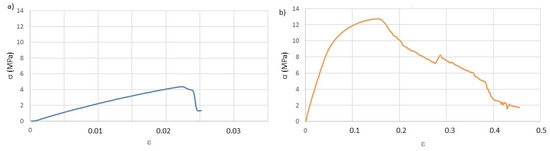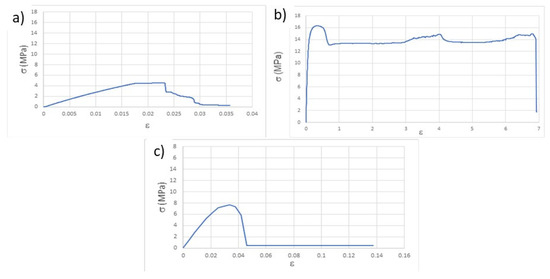 The determination of the mechanical properties through the tensile test was carried out, first, on the specimens after printing. From the stress-strain plots (σ vs. ε), as exemplified in Figure 2 and according to the ASTM D638 (American Society for Testing and Materials, D638-Standard Test Method for Tensile Properties of Plastics) standard, the following values were determined: Young’s modulus, for 0.02 deformation (E), elastic limit stress, also for deformation of 0.02 (σ), stress at break (σb) and deformation at break (εb). These last two values were assumed to be those immediately before the abrupt breakdown of the stress values because, due to the viscoelastic behavior of the thermoplastic used in the study, sometimes the fracture of the specimens was not attained. The summary of the calculated values is presented in Table 3.
