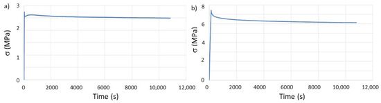 where σ0 is the value of the initially applied stress and σ the value of the stress after time t. For each specimen, three valid tests were obtained to estimate the mean average and standard deviation values. Additionally, the relaxation modulus (ER) can be calculated [30] according to Equation (3):