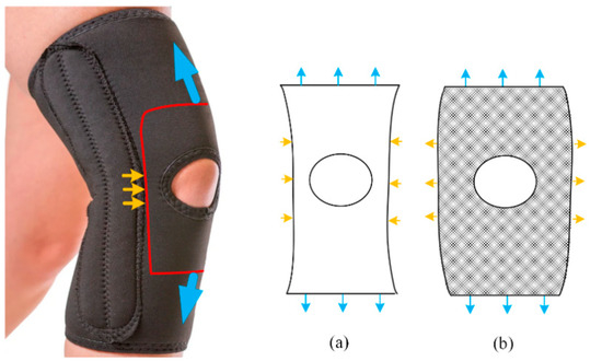 The design of protective gear for sports must satisfy strict requirements for comfort and protection [36]. Applying an auxetic to the design of protective gear may improve the cushioning effect, adhesion, and comfort. As an example, the upper and lower ends of a knee protector stretch when the knee flexes. Figure 1a shows the effect of stretching on an ordinary structure. By contrast, Figure 1b shows that the auxetic has good adhesion on both sides of the patella. The bilateral edge effect allows the auxetic to adhere to the knee joint without affecting the position and flexibility of the brace. Of course, this is only a superficial example of the design of a knee protector. It is not a protective gear that we want to design.