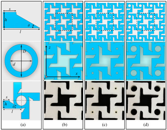 Dimensions and printing model of the unit cell: (a) basic shapes and sizes; (b–d) assembled and printed models with hollow circle diameters of d = (b) 0, (c) 1, and (d) 3 mm.