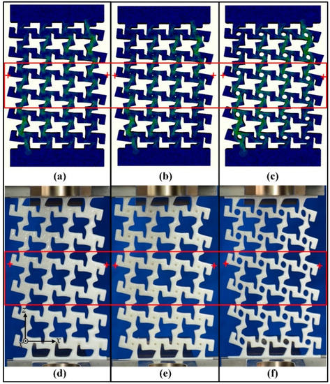 Three types of specimens were fabricated from thermoplastic urethane (TPU, Lubrizol, Wickliffe, OH, USA) (density of 1.2 g/cm3, elastic modulus of 30 MPa, and Poisson’s ratio of 0.45) [24] with different hollow circles (d′ = 0, 1, and 3 mm) using the 3D printer EP-3850 ((E-plus-3D, Beijing, China). The specimens are shown in Figure 3d–f. The specimens were printed at the highest precision mode available (layer thickness of 0.3 mm and air supply of compressed air). Because of the limited accuracy of the printer, many details were not clearly displayed by the specimens. For example, Figure 3b,e show a model and specimen, respectively, with equivalent parameters (i.e., d = d′ = 1 mm), but the specimen in Figure 3e has no hollow circle, just a pit. Tensile tests were performed on the specimens (five for each type) using a universal testing machine (Zwick010, Zwick/Roell, Ulm, Germany), where the load was applied along the z direction. As shown in Figure 3d–f, each specimen was clamped on both sides, the bottom was fixed, and the top was moved upward at a speed of 3 mm/min. The left and right sides of the specimen were allowed to move freely. During the stretching process, a camera was used to take pictures of the front side at preset intervals. These images were used to calculate the transverse displacement in the x direction and longitudinal displacement in the z direction during stretching. The results were calibrated by calculating the pixel differences between reference points in the images (red crosses (+) in the red boxes of Figure 3).