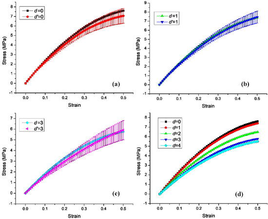The simulation results in Abaqus were used to obtain the stress–strain curve in the y direction. The model was in the elastic range when the displacement was less than 15 mm (strain was less than 0.2). Figure 4d shows the stress–strain curves obtained in the simulation (d = 0, 1, 2, 3, and 4 mm). Figure 4a–c shows the corresponding stress–strain curves in the tensile tests (d′ = 0, 1, and 3 mm).