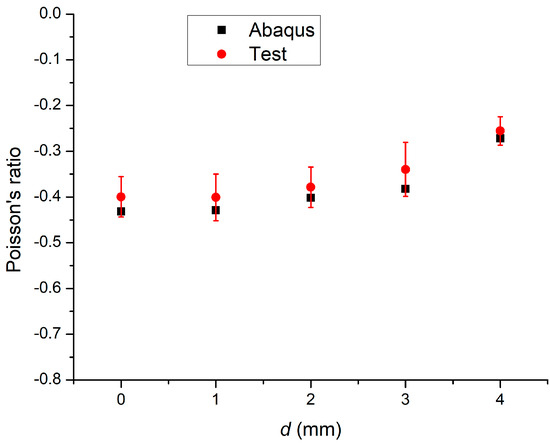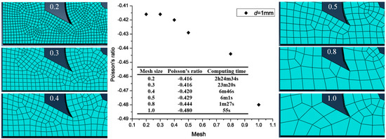 The Poisson’s ratio was affected by the mesh size. Different mesh sizes were considered: 0.2, 0.3, 0.4, 0.5, 0.8, and 1. As an example, Figure 8 shows the relationship between the mesh size and Poisson’s ratio at d = 1 mm. Although the Poisson’s ratio decreased with increasing mesh size, the Poisson’s ratio remained the same at mesh sizes of 0.3 and 0.2 (−0.416). This indicates that a mesh size of 0.3 was conducive for calculation accuracy.