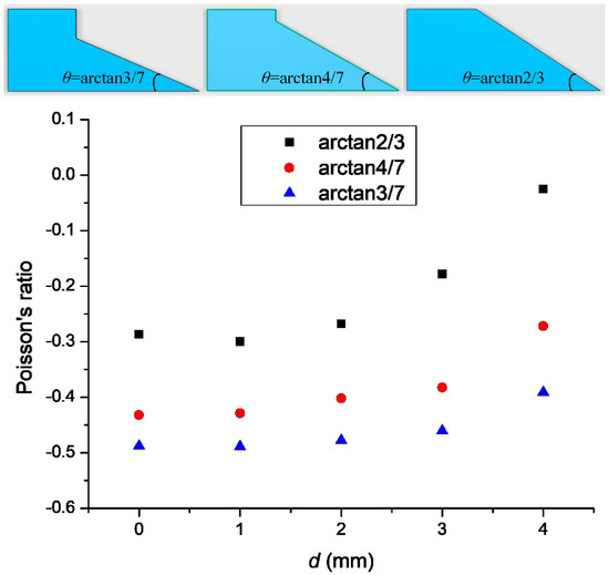 Models with different θ and different mesh sizes were also considered in the simulation. As shown in Figure 6, θ = arctan 4/7, θ = arctan 2/3, and θ = arctan 3/7 were considered. The Poisson’s ratio increased 38.7–93.6% with increasing θ. Each curve showed the same trend. Increasing θ reduced the rotation effect of the cell structure, which explains the increase in the Poisson’s ratio.