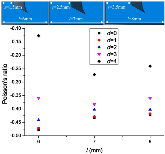 Changing l was also found to affect the Poisson’s ratio. As shown in Figure 7, l = 7, 6, and 8 mm were considered. Although the Poisson’s ratio increased with d for all three l values, the range of the increase was different. The l = 6 mm model had the greatest range for the Poisson’s ratio (−0.1 to −0.5), followed by the l = 8 mm model (−0.2 to −0.4) and then the l = 7 mm model (−0.3 to −0.4). Thus, varying l or s affected the Poisson’s ratio of different models, and the trends were consistent. The most suitable Poisson’s ratio can be obtained by adjusting l or s. According to the design requirements of protective gear, the structure with the smallest variation in the Poisson’s ratio is the ideal choice. However, the simulation results still needed to be verified against the experimental results.
