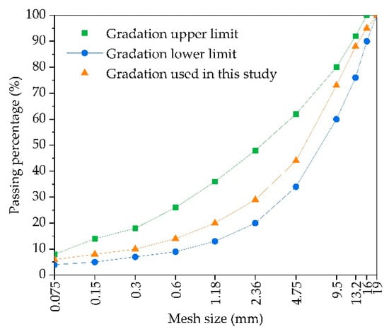 The main purpose of asphalt mixture design is to determine the mineral aggregate gradation and the optimal asphalt content in asphalt mixture. According to “Technical specifications for construction of highway asphalt pavements” (JTG F40-2004) [], combined with the engineering experience, the mineral aggregate gradation of asphalt mixture (AC-16) used in this study was determined as the median gradation, and the mineral aggregate gradation is shown in Figure 1.