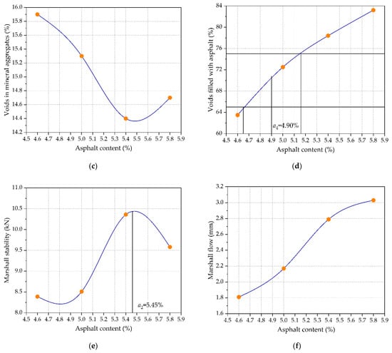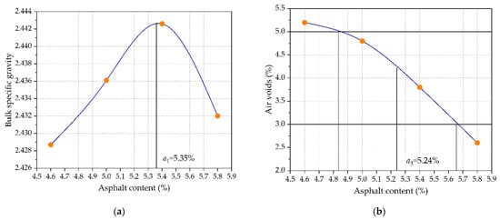According to the Chinese specification requirements of “Standard test methods of bitumen and bituminous mixtures for highway engineering” (JTG E20-2011) [], the bulk specific gravity, air voids, voids in mineral aggregates, voids filled with asphalt, Marshall stability, and flow value could be measured for the prepared standard Marshall specimens, as shown in Figure 2. Then, the optimal asphalt content of AC-16 would be determined at the maximum bulk specific gravity and Marshall stability, median air voids, and voids filled with asphalt. According to “Technical specifications for construction of highway asphalt pavements” (JTG F40-2004) [], OAC1 = (a1 + a2 + a3 + a4)/4 = 5.23%, OAC1 = (OACmin + OACmax)/2 = 5.10%, and OAC = (OAC1 + OAC2)/2 = 5.16%. Therefore, the optimal asphalt content in this study was 5.16% based on the Marshall design results.