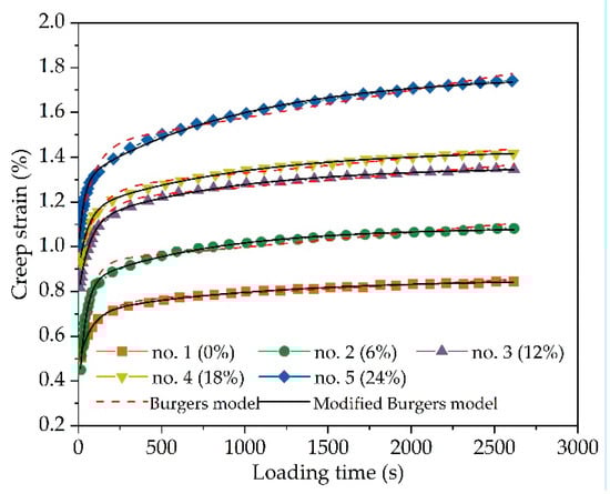 Asphalt mixture is a typical viscoelastic material, and the constitutive equation of the viscoelastic model is used to study the creep behavior of asphalt mixture. Two commonly used viscoelastic models, i.e., the Burgers model and modified Burgers model, are adopted to fit the above-measured creep deformation curves. The Burgers model and modified Burgers model have been described in detail in previous studies [,,], and are given in Equations (1) and (2).
