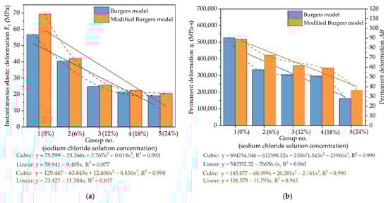The variation of viscoelastic parameters with different chloride salt concentrations: (a) instantaneous elastic modulus; and (b) viscous resistance.