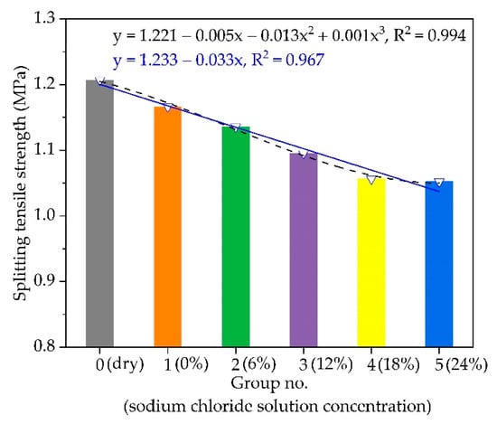 Generally, the ability of asphalt mixture to resist water erosion is known as the water stability of asphalt mixture [,]. The asphalt pavement damage caused by the lack of water stability has become one of the main distresses for asphalt pavement in China []. In the northern region, chloride snow melting salt is often used in winter to maintain smooth traffic, so asphalt pavement is often under the combined action of water, temperature, and chloride snow melting salt []. In this study, the freeze-thaw splitting test was used to study the relationship between the concentration of chloride snow melting salt and the water stability of the asphalt mixture. The specific test steps are as follows: