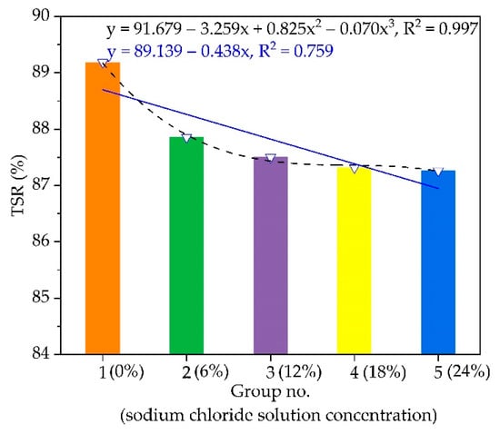 The freeze-thaw splitting tensile strength ratio (TSR) of AC-16 under different chloride salt concentrations is plotted in Figure 7. The water stability of asphalt mixture specimens soaked in water (0%) and chloride salt solution (6%, 12%, 18%, and 24%) is reduced with the increase in sodium chloride solution concentration. The TSR results of the asphalt mixture specimens soaked in chloride salt solution of 6%, 12%, 18%, and 24%, are reduced by 1.4%, 1.8%, 2.0%, and 2.2%, respectively, compared to the asphalt mixture soaked in water (0%). When the chloride solution concentration is greater than 6%, the slope of the curve increases, meaning that the effect of chloride solution on the water stability of the asphalt mixture becomes more obvious. Meanwhile, the water stability of AC-16 decreases under different chloride salt concentrations following the negative cubic polynomial function. The variation trend of TSR with chloride salt concentration changes, first quickly, then slowly. This may be due to the chloride salt solution entering the asphalt mixture from the air voids, eroding the interface between asphalt and aggregate.