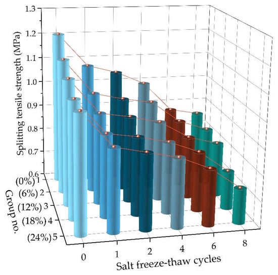 Considering the frequent rain and snow in northeast China in winter, asphalt pavement will experience more than one freeze-thaw cycle after spraying snow melting salt. In order to simulate the long-term effect of snow melting chloride salt on asphalt pavement, asphalt mixtures were conducted through 1, 2, 4, 6, and 8 freeze-thaw cycles to study the mechanical properties. Figure 8 presents the variation of splitting tensile strength with freeze-thaw cycles for AC-16 specimens under different chloride salt concentrations.