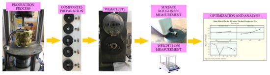 Firstly, cylindrical CuSn10 and GGG-40 bars with 22 mm diameters were cast by Canbilenler Casting Co. Ltd., with the desired chemical composition. Later, these bars were machined by a conventional lathe technique, without using cutting fluid and they were sieved in 2-1 mm sieves, respectively, to obtain metallic chips for production. More detailed information about the hot pressing process and production stages are reported in our previous studies [41,42,43]. CuSn10 metallic chips were used as the matrix material and GGG40 as the reinforcement material in the production of MMCs used in experimental studies. These materials are widely used due to their mechanical properties. Especially CuSn10 is preferred in machine parts with its superior corrosion resistance and thermal conductivity [41]. The reinforcement material GGG40, on the other hand, is used as a lubricant material in many areas thanks to its graphite and porous structures. The chemical components of these materials are shown in Table 1 [1]. Figure 1 exhibits the general methodology of the paper including the production of composites, experimental tests, measurement of properties and their evaluation. To validate the accuracy of the data all tests were repeated three times for the same configuration. Plus, at least nine measurements were taken from surfaces for each sample to evaluate the average surface roughness.