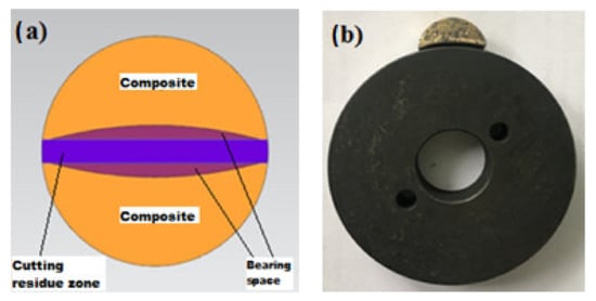 After the production of MMCs, their mechanical properties were examined in detail; as a result of these investigations, it was determined that they had sufficient strength and microstructure [1,41]. Afterward, the MMCs were brought to the geometry shown in Figure 1 to perform the abrasion tests, and the appropriate bearing geometry was provided. MMCs were processed in the geometries shown in Figure 2 before wear tests to investigate their usability as a self-lubricating bearing material. These geometries have been determined for the wear of MMCs as bearing material under suitable conditions. In determining these bedding geometries, machinability features were also considered [44,45]. The cylindrical MMCs, which come out of the MMCs production molds in the specified dimensions, are sliced in a thickness of 10 mm in the diameter direction in the jigsaw, and then the sliced parts are divided in half. In the meantime, no coolant was used and care was taken to cut the MMCs properly. During cutting with the jigsaw, the purple parts shown in Figure 2a show the losses occurring due to the 2 mm thickness of the saw blade. The pink parts show the bedding geometry of the abrasive disc material. In Figure 2b, the abrasive disc material is shown by being superposed together with the MMC on which experimental studies will be conducted. Using the literature, AISI 4140 steel was selected as the abrasive disc material [46], and abrasive steel discs with a diameter of 69 mm were brought to 55–56 HRC surface hardness after cementation heat treatment. Later, surfaces of abrasive discs were made ready for experimental studies with surface grinding processes. In addition, different abrasive discs were used for each wear test. Bearing spaces with a tolerance of 0.05 mm were created inside the MMCs, which were brought to the appropriate geometries. It has been taken into consideration that the diameter of the abrasive disc material is 69 mm in forming the bearing gaps. While creating these traces, care has been taken not to damage the surface morphology of the MMCs. Finally, ultrasonic cleaning was applied to the MMCs with the desired surface structure and brought to the appropriate geometries in the CNC machining center for wear tests. This process took approximately three minutes for each sample in deionized water. Thus, it is aimed to remove unwanted residues in the wear zone [47].