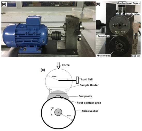 While bringing the MMC to this geometry, a CNC was used with a thickness of 10 mm and an inner radius of 69.05 mm, and then the inner surfaces were grinded, and a suitable surface structure was obtained. Due to the macro scale of the MMC components, block-on disc wear tests were carried out on the device shown in Figure 3, observing the ASTM (G77-05) standard, to investigate the wear behavior of a certain area instead of point contact abrasion. In wear experiments, the abrasive disc speed was arranged at 400 rpm (1.06 m/s) under the 30 N load considering preliminary test results [1]; it takes approximately 31 min to complete the total wear distance of 2000 m. On the upper part of the wear test setup, there is a sample holder that provides abrasion of MMCs. The sample holder is fixed and there is a disc rotating at the bottom with a shaft powered by a 2.2 kW electric motor and with a 2.5 kW speed adjuster. The abrasive discs are made of AISI 4140 steel, which has been hardened and heat-treated as stated before, and the outer parts that will carry out the abrasion are carefully prepared. The movement of the disc occurs in the clockwise direction and the horizontal forces created by the friction force are recorded instantly on the computer through the load cell. The ratio of the vertical force applied to the horizontal friction force gives the friction coefficient. This value was regularly monitored instantly during experimental studies. In addition, the contact zone between the composite material and the abrasive disc is in the specific region as shown in Figure 3c. The friction coefficient measurements were started from the first contact area of the specimen with an abrasive disc. This area may vary depending on the environment and test conditions with the further stages of wear. In addition, no sudden changes were observed in surface roughness values thanks to the constant applied load and wear rate. The friction coefficient was measured with a Squirrel brand data logger with 8 analog inputs and recorded using the Squirrel View interface program. After three repetitions, weight losses occurring during the experimental process were determined by measuring them with precision scales before and after the experiments [1].
