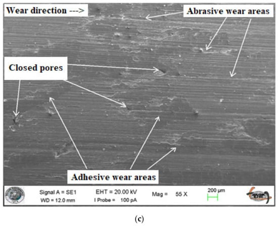 When the wear surfaces of composite materials containing GGG40 in different proportions are examined, it is seen that the surface structure of materials containing only CuSn10 is different [41,53]. First of all, surface hardness and pore structure, which are among the most important parameters affecting the wear behavior, influenced the wear characteristics. The outcomes of our previous study [41], investigating the effect of production parameters on the Brinell hardness and porosity values, confirm these interpretations. The effects of hardness and porosity values on wear properties are explained in the following sections, and the observed results are discussed with the reported studies in the literature. In Figure 4b, there are spherical graphite structures that spread to the surface after the abrasion and the filling of the porous structures on the surface as the wear time progresses. Especially in Figure 4b, the wear areas of the composite material in the mixture ratio of 70B30C were heavily affected by the abrasive dust as shown. These areas show effective adhesive wear over time due to temperature and force applied, but there are also abrasive wear zones as indicated in the picture. These abrasive wear zones usually occur early in the composite material wear process. In this process that takes place in the running-in zone, significant wear marks are formed on the surface of the composite material. Adhesive wear zones were generally formed when the matrix material separated from the surface after running-in was plastered to the surface under the effect of temperature and pressure [43]. The surface structure of the 60B40C specimen after wear is shown in Figure 4c. It was observed that the pores of the surface were mostly covered by abrasive dust. The closure of the porous structures on the surface over time provides better heat conduction by increasing the contact area during wear. Thus, the adhesive effects are minimized by preventing the composite materials from overheating in the contact area [54,55].