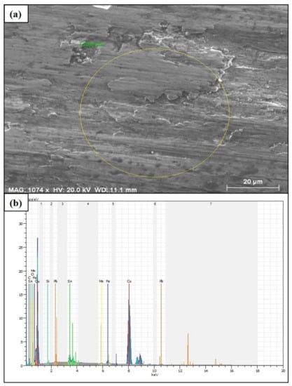 Figure 5b shows the composition differences of the MMC. Within the scanned area, different alloying elements in low ratios were determined along with 83.84% copper, 5.48% tin, 1.85% iron and 1.90% graphite by weight. In addition, the detected 2.40 wt% oxidation shows that the composite material is affected by the oxygen in the environment during wear. The presence of this oxidation is expected to occur in abrasion tests conducted under room conditions. The alloying elements in the composite material must be distributed homogeneously into the matrix during production. Hence, the wear behavior of the composite material can be evaluated entirely. In the absence of this circumstance, different material behaviors are observed in the contact areas, which negatively affects the service life of the product [56]. The compatibility of copper and tin ratios on the corroded surface of the composite material with the initial conditions indicates that the surface abrasion is homogeneous. Especially, the effect of reducing the friction coefficient of graphite makes it one of the most preferred materials for bearing materials used in machine parts. In addition, it can be said that minor abrasion occurs on the surface of the abrasive disc material, which is evident by the presence of iron detected on the surface of the composite material.