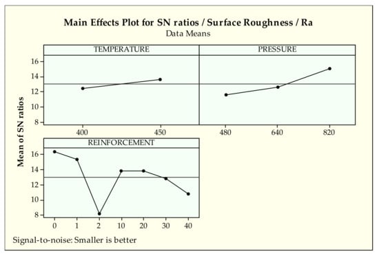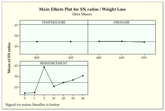 It can be observed that in Figure 8 the first levels of temperature and pressure (400 °C and 480 MPa, respectively) produce lower weight loss. When examining the effect of reinforcement of pure cast iron (2) gives the best value while pure bronze [41] (1) and no reinforcement (0%) provide the worst results for weight loss. Seemingly, from a 10 to 40 reinforcement ratio, better results are obtained.