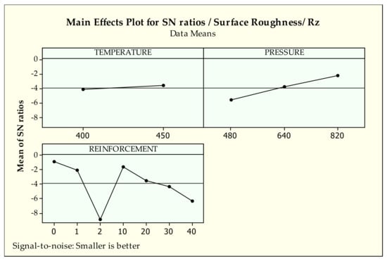 Figure 6 and Figure 7 demonstrate the signal-to-noise ratios of findings of Ra and Rz surface indicators, respectively. Since the two values have the same tendencies according to the design parameters, they were evaluated together. When the general trend of the parameter levels are identified, it can be said that higher S/N ratio values give the best level. Considering Figure 6 and Figure 7, it can be stated that there is a common effect of production parameters on the surface properties. In other words, as the production parameters, i.e., pressure and temperature, are increased, the surface roughness values are decreased. This observed phenomenon is attributed to better interfacial bonding quality between metallic chips due to increased production parameters [43]. The elevated pressure and temperature have positive effects on the metallic chips’ softening and plastic deformation mechanism. These circumstances supply successful penetration of the tin bronze chips into cast iron chips, resulting in good structural integrity in the MMCs systems.
