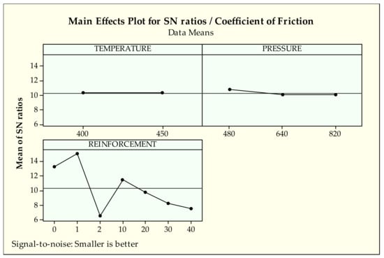 As it is seen in Figure 9, the first levels of pressure, 480 MPa, and temperature, 400 °C, seem to be the best choice for the coefficient of friction according to the main effects plot for S/N ratios. For the influences of reinforcement, it can be said that pure bronze (1) provides the most proper coefficient of friction conditions followed by the no reinforcement ratio (0%). After those effects, from 10 to 40 additions, reinforcement makes a negative influence on the coefficient of friction.
