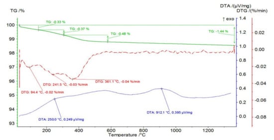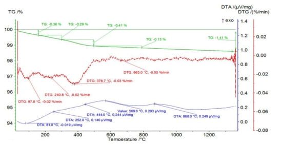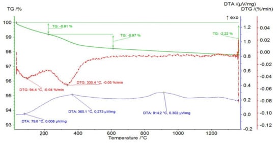 Thermogravimetric analysis was carried out to investigate the phenomena occurring in the fabricated ceramic fittings as a function of temperature at the assumed temperature process. The scope of the study included measuring mass loss and thermal effects as a function of temperature using Netzsch’s TG 449 F1 Jupiter thermogravimetric analyzer. Measurements were carried out in alundum crucibles. The green samples crushed in an agate mortar were the samples for analysis. The weight of the test portions was ~30 mg. Such small amounts of weighting guarantee excellent signals. The analysis was carried out in a flow of synthetic air (80/20 mixture of nitrogen and oxygen). The flow was constant and set at the value of 70 mL/min. Measurements were carried out in the temperature range from 24 to 1400 °C with a heating rate of 10 °C/min. The heating rate is much higher than the heating rate during the sintering process, which is because the signals in the Differential Thermal Analysis—DTA curve are more pronounced under these measurement conditions.