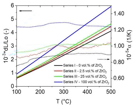 The values of the technical expansion coefficients in the temperature range of 100 to 500 °C are shown in Table 4. The values of the technical coefficient of expansion are averaged values of the coefficient of expansion. The values of the coefficients as a function of zirconium oxide content are shown in the chart in Figure 6. The chart shows the nonlinear nature of the dependence of the expansion coefficient on the concentration of zirconium oxide in the composite. Small amounts of zirconium oxide (2.5 vol.%) cause a jump in the coefficient from 8.79 × 10−6 1/K for the alumina sample to 9.56 × 10−6 1/K for the composite containing 2.5 vol.% of zirconia. Such a phenomenon may indicate the presence of other phases in the composite (the composite is not a physical mixture). In contrast, composites containing 25 vol.% of zirconium oxide have a technical expansion coefficient value of 9.92 × 10−6 1/K. This value is consistent with the linear nature of the coefficient changes (estimated from the law of additivity of properties).