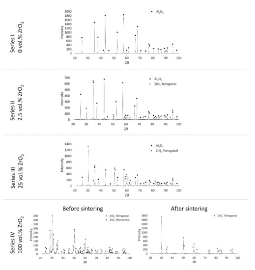 Within the framework of the present work, four series of samples were made: Series I—0 vol.% of ZrO2, Series II—2.5 vol.% of ZrO2, Series III—25 vol.% of ZrO2, and Series IV—100 vol.% of ZrO2. The compositions of each series are shown in Table 1.