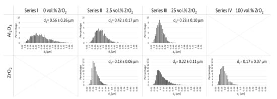 Histograms of grain distribution of Al2O3 and ZrO2 in individual series.
