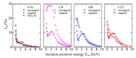 The uncapped films prepared with different templates show their own characteristics in I3γ profiles (Ein < 3.0 keV). For the film with F38, the initial increase and gradual decrease of I3γ suggests a high pore interconnectivity [7]. The initial increase and plateau of I3γ disappear for the other three films. For the film prepared with P103, I3γ falls sharply to a quite low value (~3%) with increasing Ein to ~1.0 keV, indicative of few Ps atoms capable of emitting out from the inside film with low pore interconnectivity [6]. High Ps diffusion coefficients through well-connected pores [7] are revealed by the gradual decline of I3γ with the increase of Ein to ~3.0 keV for the films templated by F88 and F127. It is worth noting that for the two films, the open porosity/interconnectivity are very high, despite their lower I3γ values in comparison with that for the film with F38. As was observed by the TEM images reported previously [5], worm-like pores and cage-like pores are formed in the film with F38 and F127, respectively. The larger cages are interconnected via smaller channels, which make thermalized Ps atoms likely confined in the larger cages and hardly able to pass through the smaller tubular channels between the cages to diffuse out from the films due to the Ps quantum confinement effect [5,30,31]. The results suggest that Ps diffusion is strongly affected both by open porosity/interconnectivity and pore morphology [32].