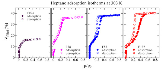 The heptane adsorption–desorption isotherms at 30 °C (303 K) of the mesoporous silica films prepared with P103, F38, F88 and F127, respectively. (The isotherms for the films with F38 and F127 are reprinted with permission from [5]. Copyright 2012 American Physical Society).