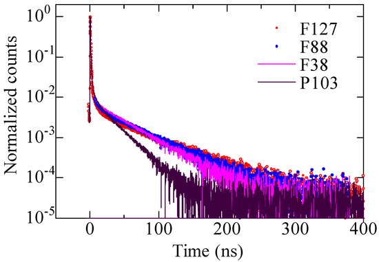 Positron annihilation lifetime spectra recorded at Ein = 2 keV for the capped mesoporous silica films prepared with P103, F38, F88 and F127, respectively. (Positron annihilation lifetime spectra for the films with P103, F38 and F127 are reprinted with permission from [12]. Copyright 2006 Elsevier).