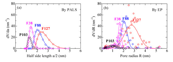 Pore size distributions (PSDs) of the films with various templates are displayed in Figure 4, calculated (a) by PALS according to the RTE model [10,22,23] from the longest-lived o-Ps lifetime distributions of Figure 3 and (b) by EP based on the BJH model [39] from the corresponding desorption isotherms of Figure 2. For the F38 templated film with worm-like channels, the pore size was calculated by PALS under assumption of rectangular pores because of its high interconnectivity, while the pore size of cage-like pores was calculated assuming cubic pores for the other three films. Predominant peaks of PSD can be seen for all films. The average pore sizes deduced by PALS are very close to those by EP. The average pore side lengths by PALS are about 2.60, 2.96, 4.37 and 5.63 nm for the films with P103, F38, F88 and F127, respectively, and the BJH pore diameters are around 2.20, 3.25, 4.18 and 5.46 nm, respectively.
