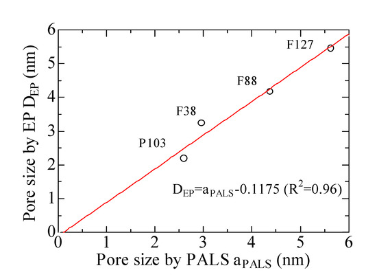 The comparison of the average pore sizes obtained by PALS (aPALS) and EP (DEP) is plotted in Figure 5. The circle represents the pore size calculated by the two methods. All the pore sizes fall on a fitted line of slope k = 1 with the fitting variation of R2 = 0.96, as seen red line in Figure 5. The linear fitting R2 approaches to 1, indicating that both PALS and EP can precisely measure the mesopore size of porous silica films prepared with various polymeric templates. Further, the fitting result shows that relatively larger average pore sizes were obtained by PALS, because Ps atoms were preferentially localized in larger pores.