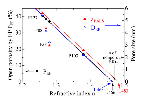 The open porosities measured by EP (PEP) (black solid circles) and pore sizes obtained by PALS (red solid triangles) and EP (blue open triangles), respectively, versus the refractive index as well as the copolymer templates are exhibited in Figure 6. The black dashed line is the linear fitting results of the refractive index dependence of the open porosity. The PEP is evaluated by the simplified Lorentz–Lorenz equation, as formulated in Equation (1) with the measured no. A linear relationship between the open porosity and the refractive index appears for the films with various triblock copolymers. Interestingly, this relation offers the refractive index n = 1.466 for nonporous silica if the line is extrapolated to open porosity for PEP = 0.