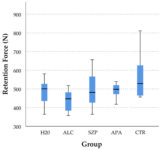 Boxplot of the median (IQR) retention force (N) among the five groups.