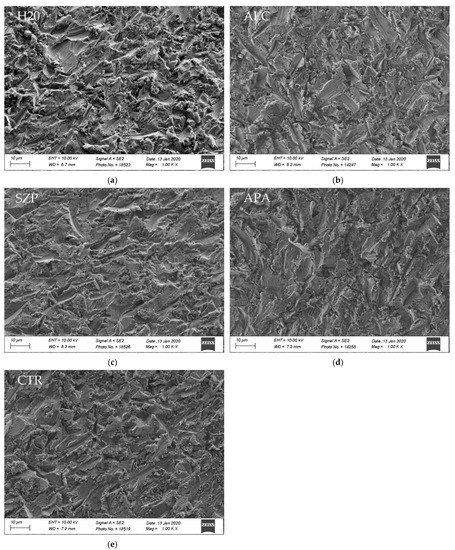 The SEM surface analysis did not reveal visually recognizable differences (Figure 2a–e).