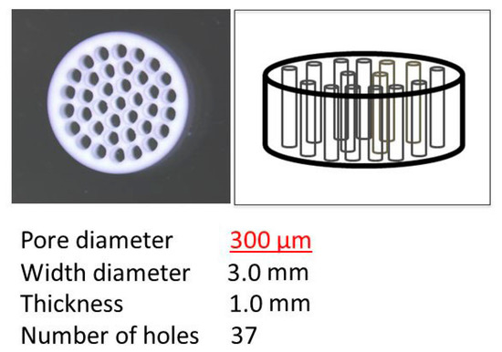 The honeycomb TCP scaffolds used in this experiment were pressed into a cylindrical shape through holes with diameters of 300 μm (300TCP), as shown in Figure 1. The details of the manufacturing method of honeycomb TCP scaffolds have been described previously [24].