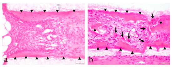 Histological images of formed hard tissues. (a) Hard tissue in the experimental group. (b) Hard tissue in the control group. Arrowhead: Bone-like hard tissue, Arrow: Multinucleated giant cell. The scale bar indicates 50 µm.