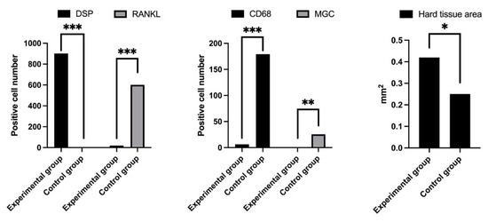 The amount of IHC-positive cells and hard tissue formed per unit area of the tissue samples was evaluated. The number of DSP-positive cells (experimental group 902.4, control group 0.0) was significantly higher in the experimental group (p < 0.0001) (Figure 4). The number of RANKL-positive cells was 19.2 and 601.6 in the experimental and control groups, respectively (Figure 4), which was significantly different (p < 0.0001). The number of CD68-positive cells (6.4 in the experimental group and 179.2 in the control group) was significantly higher in the control (p < 0.0001) (Figure 4). The number of multinucleated giant cells (0.0 in the experimental group and 25.6 in the control group) was also significantly higher in the control group (p < 0.01) (Figure 4). The hard tissue area (0.42 mm2 in the experimental group and 0.25 mm2 in the control group) was significantly larger in the experimental group (p < 0.05) (Figure 4).