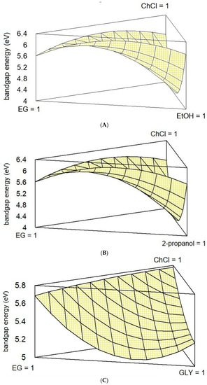 In this context, the possibility to model the band gap energy (BGE) and monitoring its variation in ternary mixtures composed by one HBA (choline chloride, ChCl), a first HBD (ethylene glycol, EG), and a second HBD (ethanol-EtOH (A), 2-propanol (B), or glycerol-GLY (C)) is herein explored. In particular, a Design of Experiments (DoE) approach followed by multivariate analysis was employed to finally plot a surface representative of the variation of the BGE depending on the molar fraction ratio between the constituents of each system. According to the DoE, seven samples were prepared for each one of the three systems (A, B, C) for a total of 21 experiments, which were subjected to the graphical Tauc plot method for the determination of the BGE.