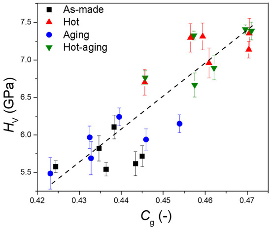 | Glass ID | HV as-made (GPa) | HV hot (GPa) | HV aging (GPa) | HV hot-aging (GPa) |