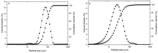 Grain size distribution of powders; (a) Ni-25Graphite, (b) Cr3C2-25(Ni20Cr).